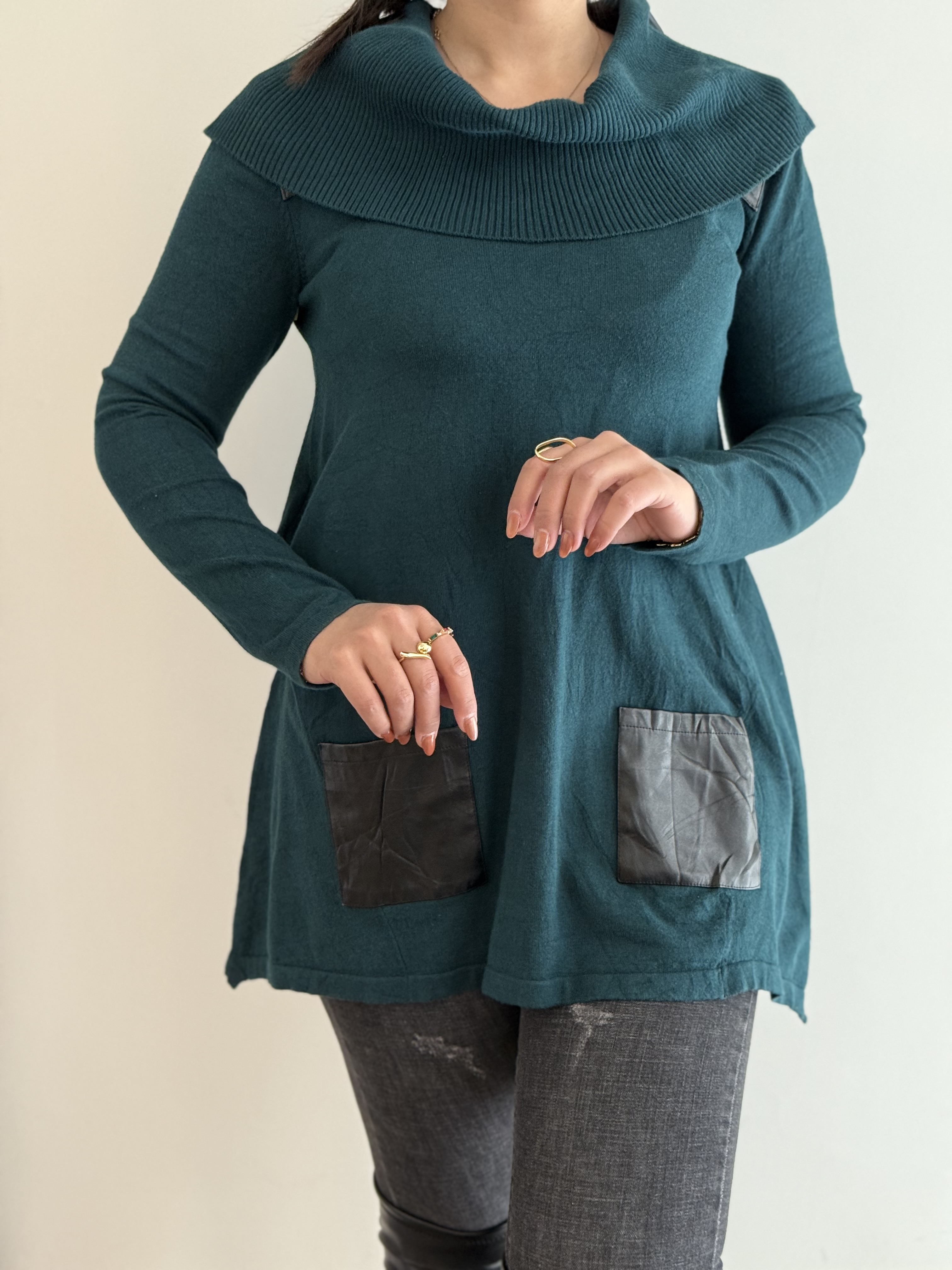 تونیک یا شومیز بلند بافت ترکیبی با چرم