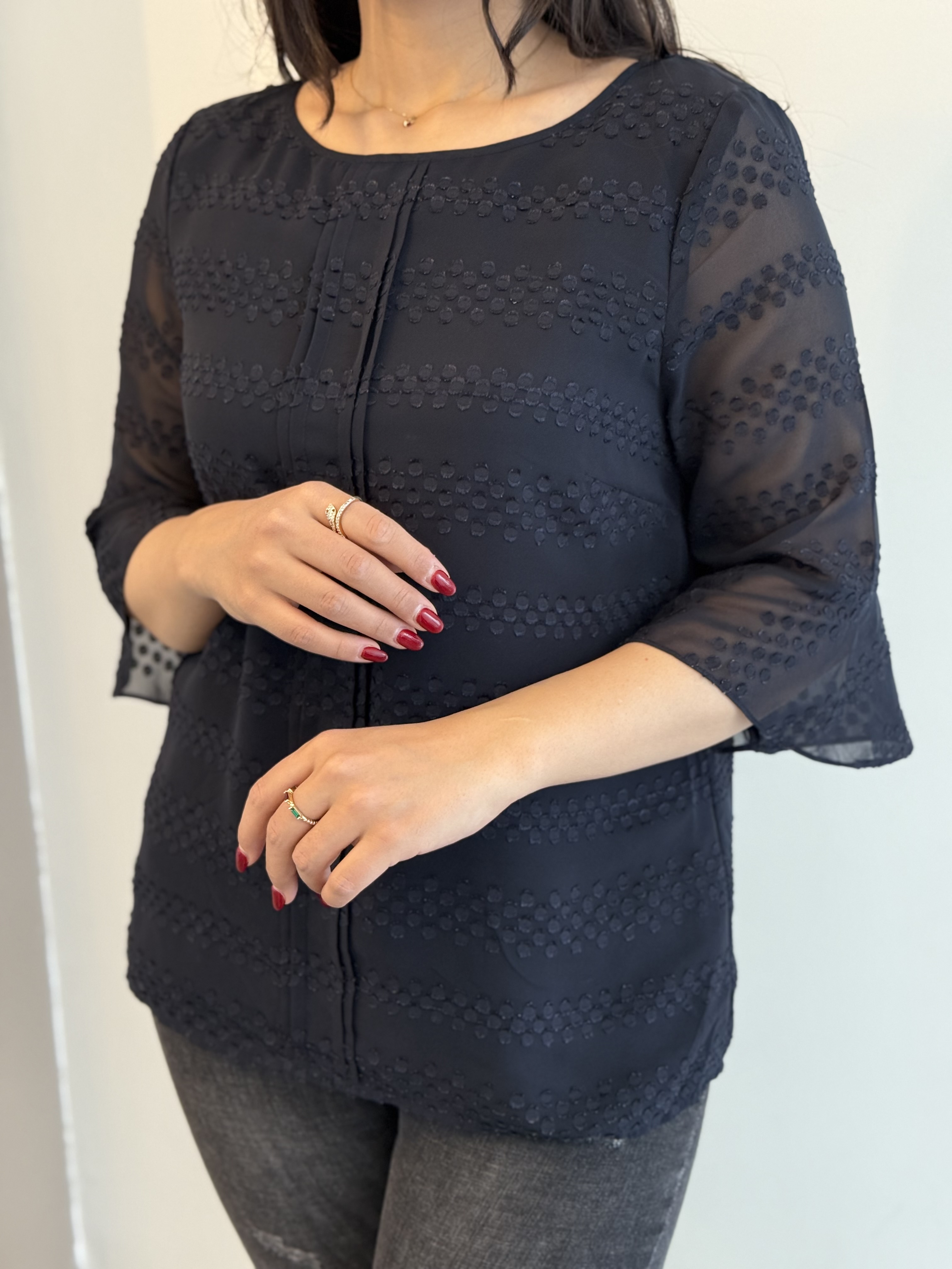 ناموجودشومیز مجلسی سورمه ای کرپ طرحدار