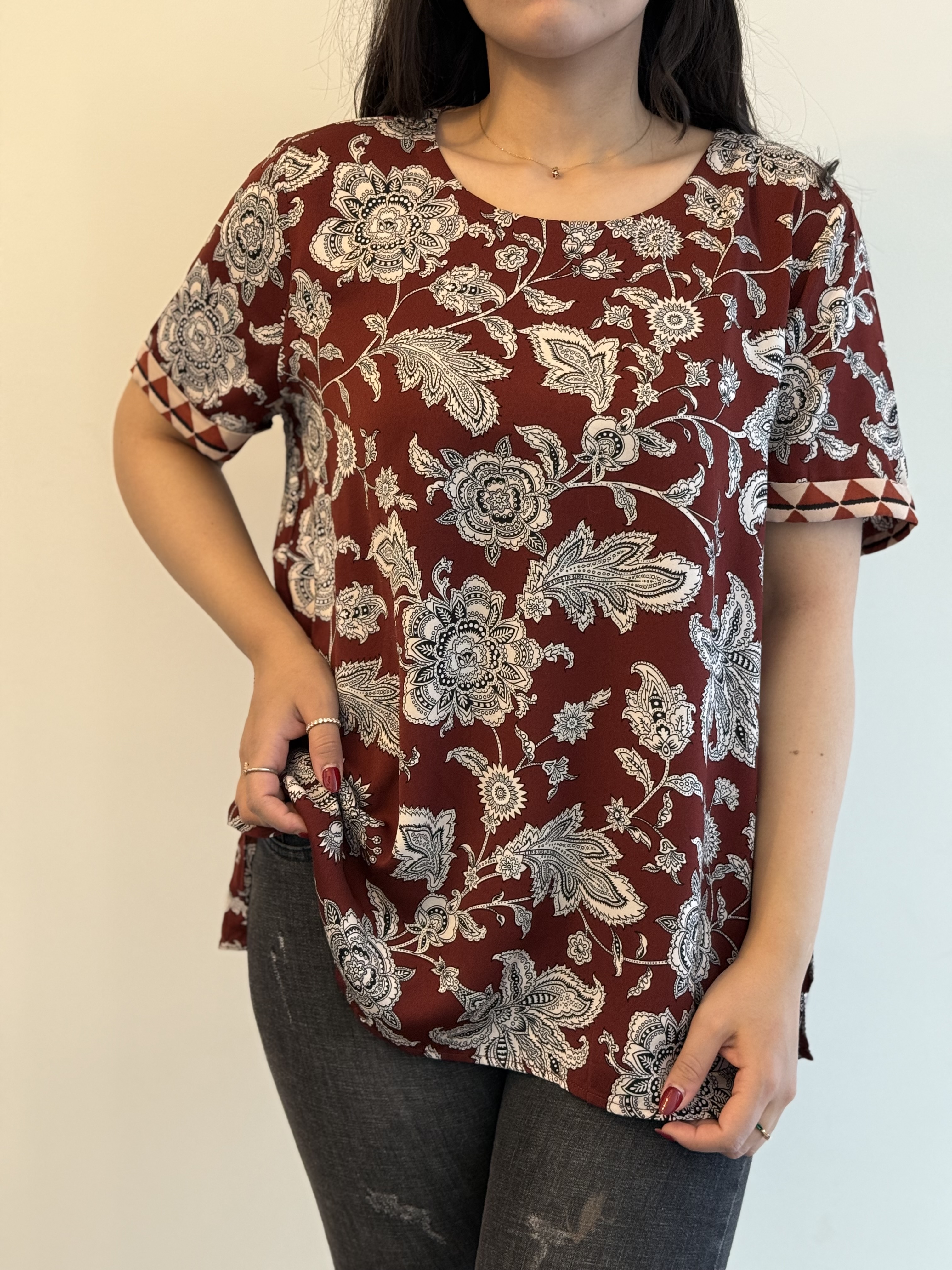تیشرت نرم زرشکی گلدار